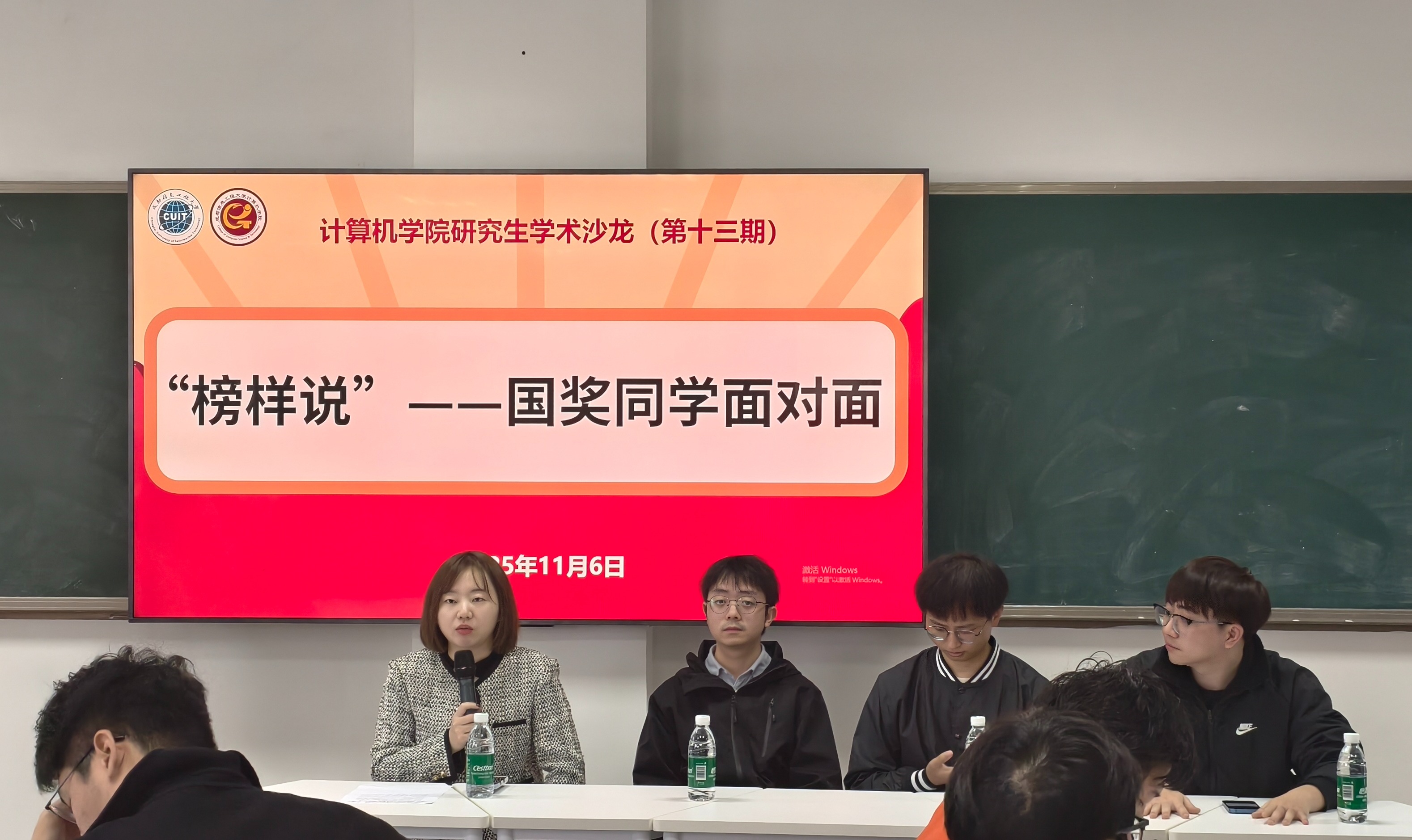 11月6日,计算机学院研究生学术沙龙(第十三期)“榜样说”——国奖同学面对面活动在志学楼H5201举行。计算机学院辅导员曹佳阳、研究生国家奖学金代表袁海、寇毅、李天豪以及低年级研究生代表110余人参加本次活动。
