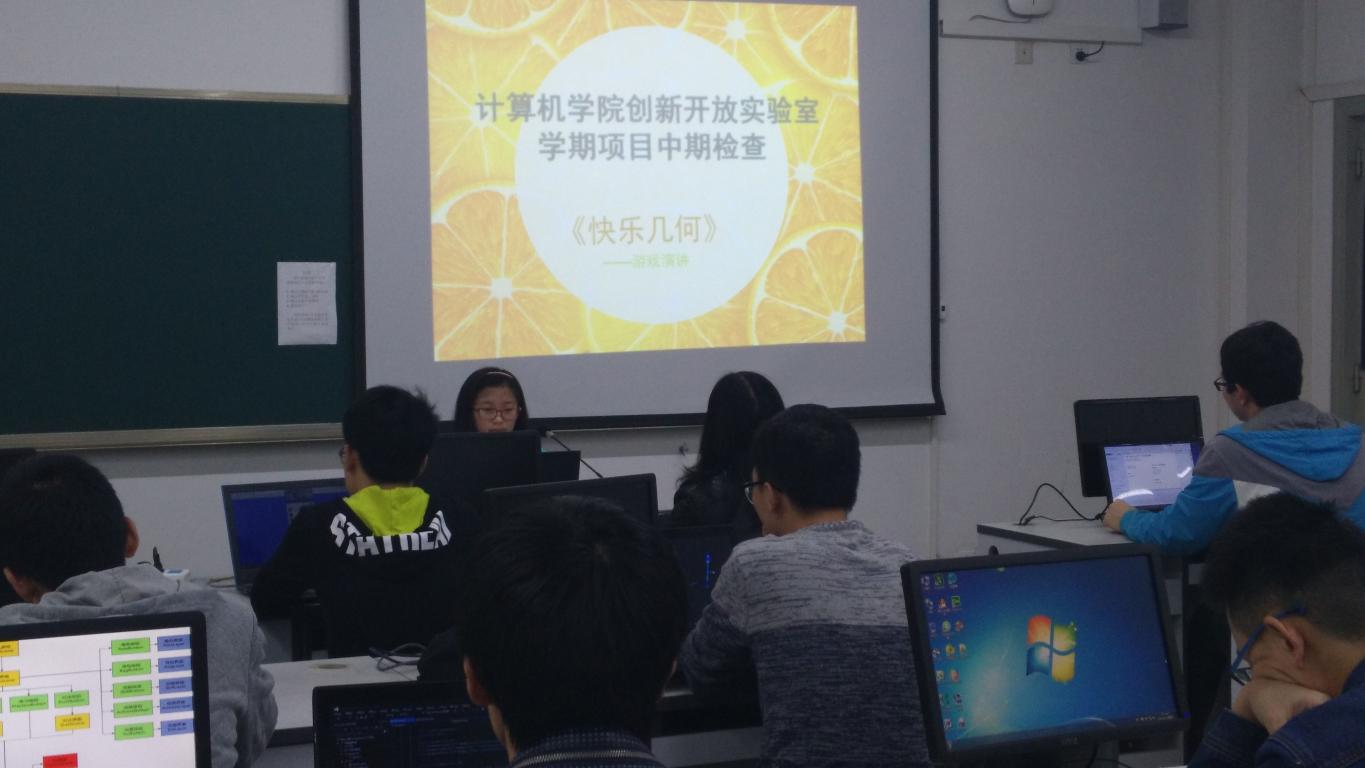 2016年11月2日下午7-8节课,计算机学院对创新开放实验室的学期项目进行了中期检查答辩。 学生要完成学期项目中期进展报告,准备好上台答辩演讲的PPT,讲完后要回答老师和同学们的提问。学生针对学期项目开题报告要求,利用前面八周的业余时间自主学习相关内容,绝大多数完成了可演示的系统或作品基本功能。实...